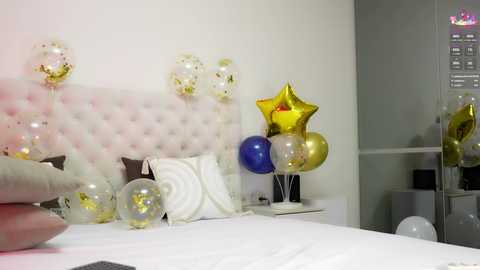 Video of a fair-skinned woman with long brown hair wearing a white strapless corset, kissing her finger seductively, in a cozy, dimly-lit bedroom with a lit snowflake decoration, a lamp, and a bed in the background.